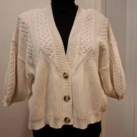 Gestuz Enid strikkejakke str 38. Er brukt en del og har en del nupper (kan kanskje få bort det meste med nuppemaskin). Veldig fin! Og lett å slenge på seg! Ull-blanding.