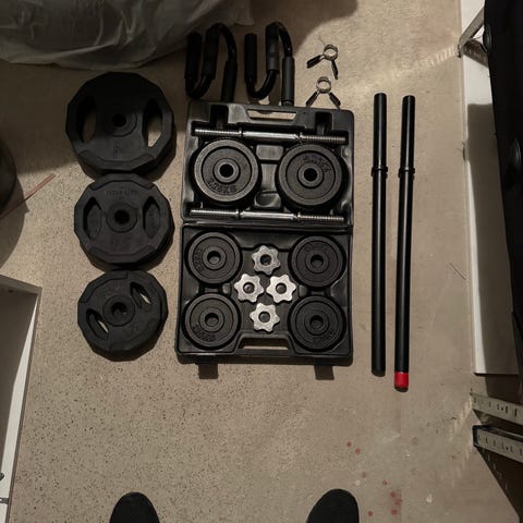 Vektkoffert,13,6 kg.Dumbbell-sett med flere vektskiver og justerbar stang. Settet inkluderer en bærbar oppbevaringskoffert for enkel transport og organisering av vektskivene. Passer for styrketrening og generell trening.
