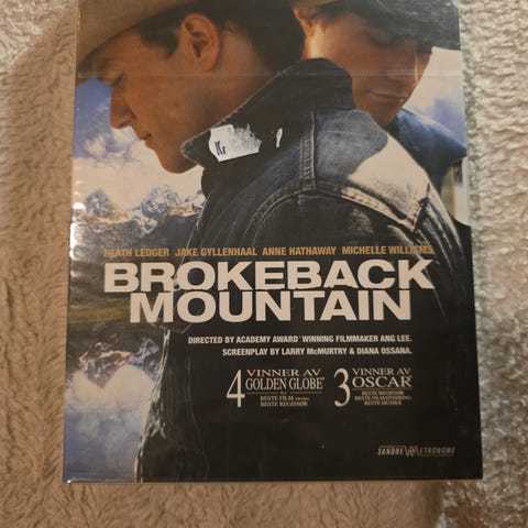 Brokeback Mountain DVD med originalversjon og undertekster. Inkluderer bonusmateriale som intervjuer og bak kulissene-innhold. Filmen er regi av Ang Lee og har en spilletid på ca. 134 minutter.