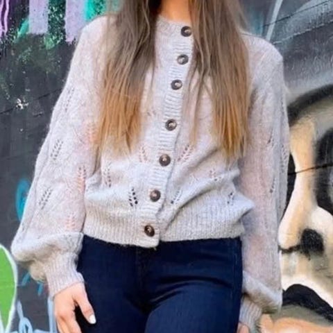 Strikket cardigan i lin. Rund hals. Lange ermer. Lukkes med knapper på framsiden. Ribbestrikkede kanter . Bølgende stoff.