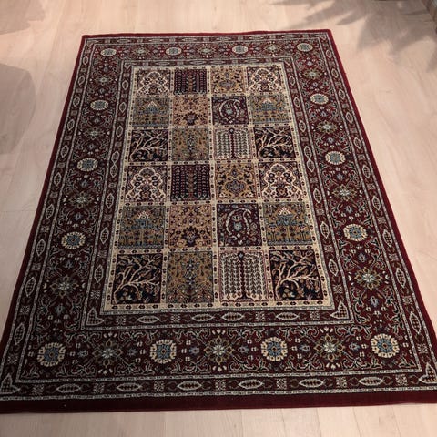 Håndlaget teppe fra osta carpets i ren kvalitetsull. Veldig godt å gå på med god isolerende evne, med over 900 000 knuter pr m². Dette utgjør en ekstrem tetthet og god holdbarhet. Gulvteppe er laget i Belgia og importert til Norge på 70-80-tallet.