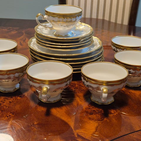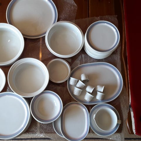 Hbo 5800. Figgjo, Gul Marie - 9 middag/9 dype/9 dype/3 ovale fat/1 stort rundt fat/2 sausnebb/2 potetboller - samlet 35 deler. 4 tallerkner har krakl.1 med nagg. I det hele god stand. Drammen eller sendes mot porto