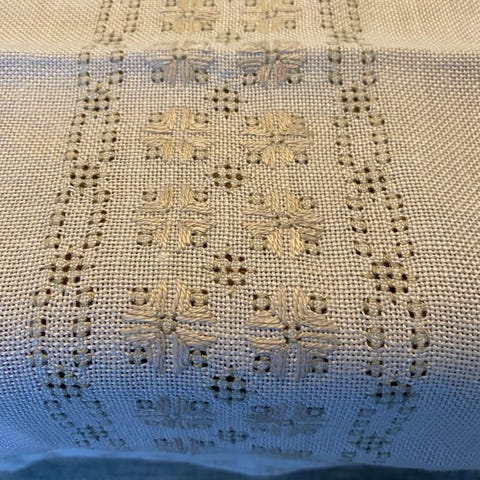 Pen, eldre brodert duk i lin. Alle annonser: 3 for 2.