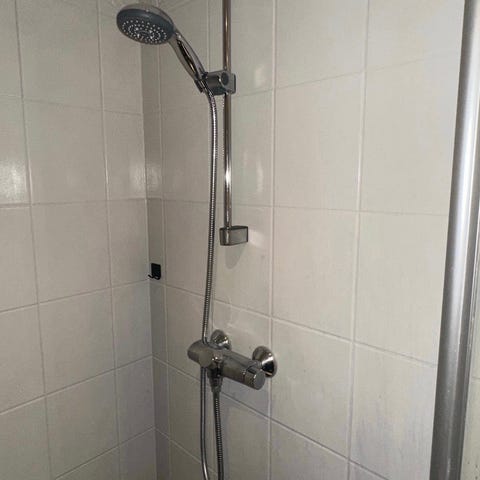 Grohe termostatstyrt dusjbatteri og dusjsett med hånddusj i krom. Enkel justering av temperatur og vannmengde. Egnet for veggmontering i dusj. Slangen kan med fordel byttes ut da den har hull (koster 139,- på Megaflis).