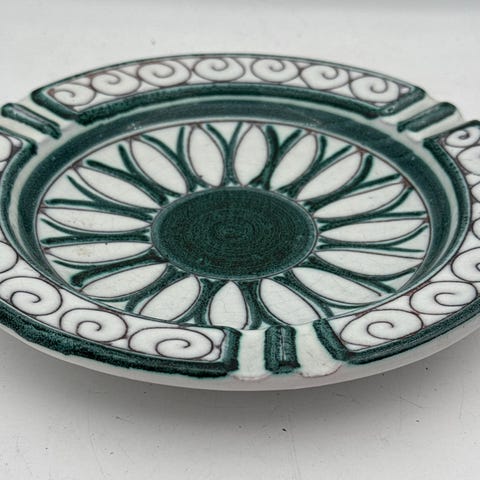 Keramisk fat med dekorative mosaikkstein i røde, hvite og brune nyanser. Fatet har en rund form og et bredt kantområde. Egnet til bruk som serveringsfat eller dekorativt element.