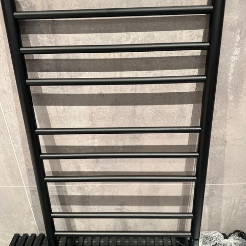 Svedbergs Elektrisk håndkletørker i hvit farge med flere horisontale rør for oppvarming. Leveres med kontrollpanel med knapper for justering av temperatur og funksjoner.