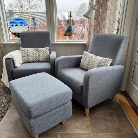 2 pent brukte gode lenestoler + pall i brunt stoff til salgs. Kjøpt på Skeidar tilbake i tid.