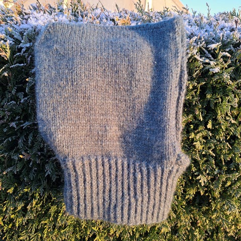 En brun og en blå hjemmestrikket balaclava selges. De er helt nye. strikket i Drops mønster 234-14, garnet er fra Drops, Brushed Alpaca silk og Alpaca