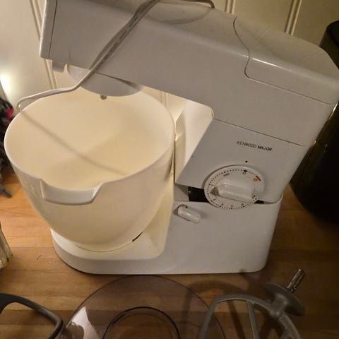 Kenwood major classic kjøkkenmaskin med visp, eltekrok, k-visp, blender og ekstra bolle i plast. Tror den kan være rundt 15 år gammel, men har vært relativt lite brukt. Har hatt vanskeligheter med å få eltekroken både på og av, vet ikke om dette er noe som kan fikses. Lokket har fått en knekk og er litt løst, men fungerer greit. Resten av tilbehøret fungerer fint.