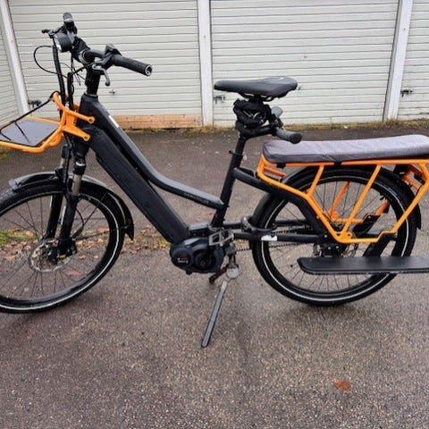 Sykkelen er utstyrt med to seter bak, kraftig midtmotor, stort batteri, lasteplan foran, lys foran og bak, barnegrind, kicstands, skjermer foran og bak, justerbar stem, justerbar sete, fotstøtter, hydrauliske bremser, 7 gir, oppsett for et ekstra batteri(aldri brukt) og dempegaffel foran.