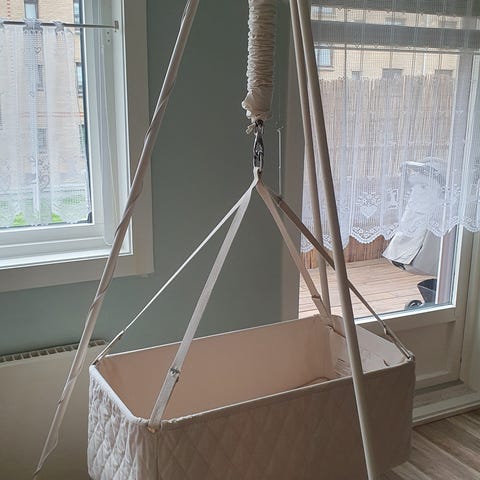 Inkluderer nyrenset hengevugge, madrass, madrass-beskyttelse, vuggemotor og stativ. Enkel å montere hvor som helst i husstanden og kan pakkes ned for enkel frakt.