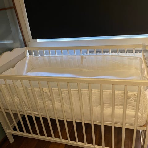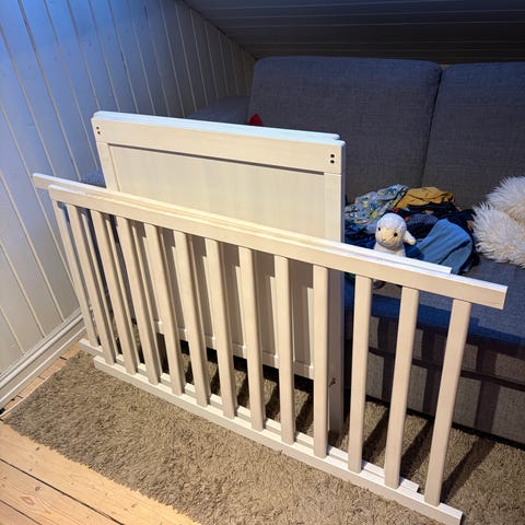 IKEA Sundvik Sprinkelsengi hvit farge. Den kan også omgjøres til en liten seng ved å fjerne en side, noe som gir fleksibilitet i bruk, se bilde.