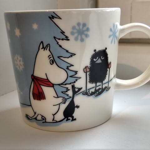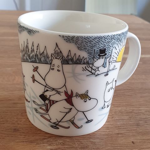 Selger en pent brukt Mummikopp fra 2014, med motivet «Skitur med herr Brisk».