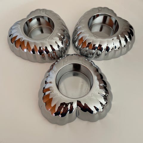 Georg Jensen dekorasjon ornamenter laget i rustfritt stål. Settet består av tre ulike størrelser med en bølget, organisk form. Passer som dekorative elementer i hjemmet eller i kontor miljø