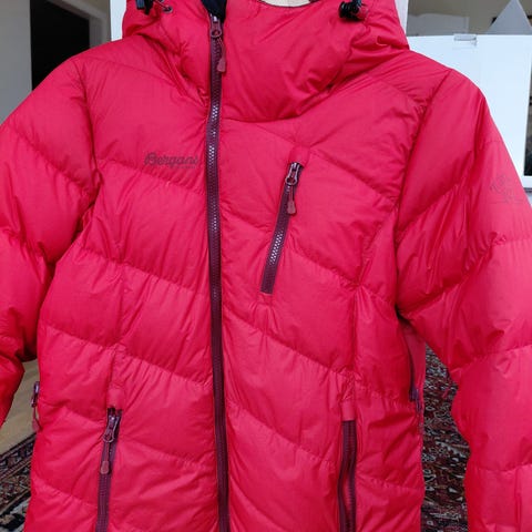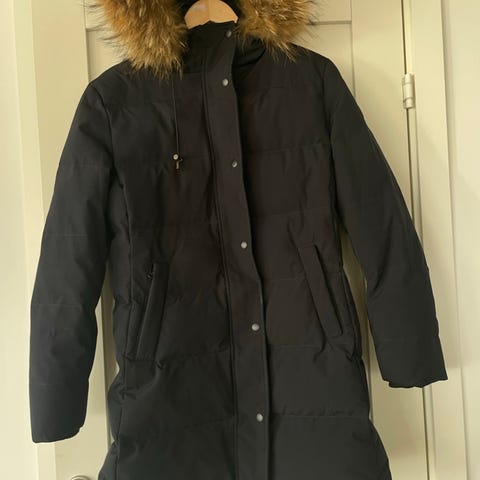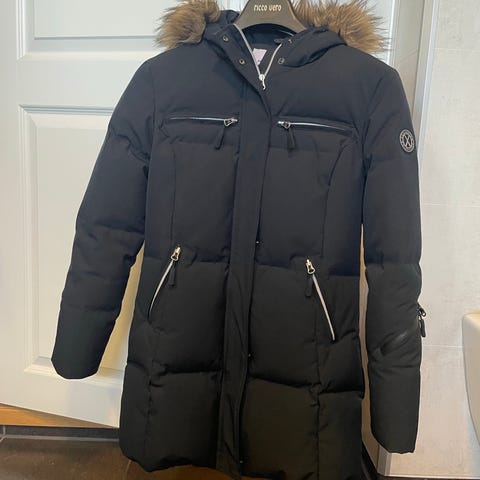 Portofino dunjakke i mørk blå farge, størrelse M /40 for dame. Oppleves som en str 38. Jakken er laget av dun og har flere glidelåslommer. Den har hette med pelskant og ribbestrikkede mansjetter. Pelsen kan tas av.
