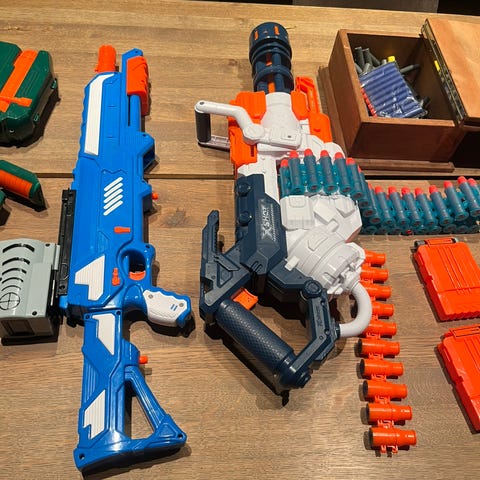 Elektrisk Nerf rifle med avtagbar forlenger, håndgrep, sikte (med fire forskjellige fester) og magasin med plass til 10 skudd. Kommer med 24 skudd.