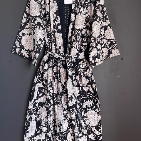 Nydelig kimono jakke, laget med unikt håndarbeid. Hvert design i denne serien vil kom i en håndfull eksemplarer, og alle er unike. 100% indisk bomull. Laget av indiske tepper. One size. Passer M og L. Ny pris 1699. Fra By Linn Andersen