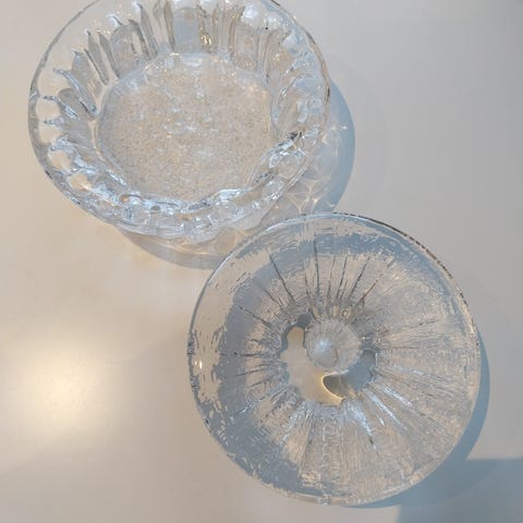 Krystallbolle på stett med slipte stjerner og matte blomster.En serie av Hadeland Glassverk.Høyde 11 cm, bredde 16 cm