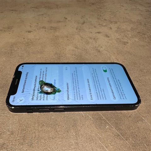 Apple iPhone 12 mobiltelefon med 64 GB lagringskapasitet i svart farge. Telefonen har en skjerm med synlige riper og sprekker. Enheten lades via USB-kabel og har et bakdeksel med riper. Ca 80% batteri kapasitet. Telefonen funker helt fint og sånn den skal, ingen problemer med den.