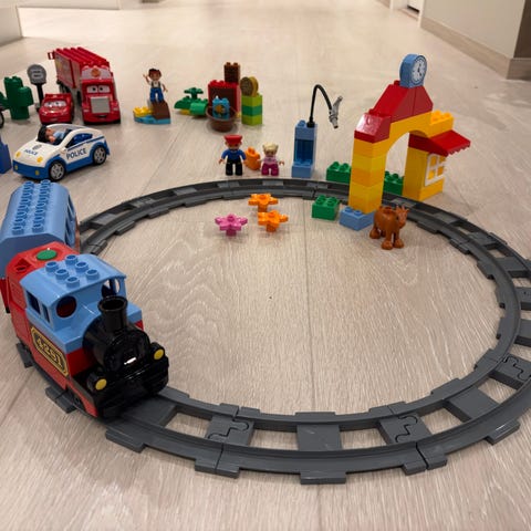 LEGO DUPLO City togsett med kran, tog, båter og tilhørende figurer. Inneholder fargerike byggeklosser designet for små barn, med fokus på enkel montering og lek.