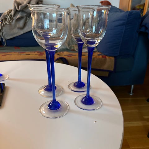 6 glass og en mugge. Brukt og et av glassene har en sprekk me ingen skår. Pene og unike glass.