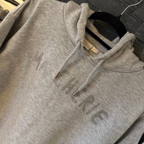 Hettegenser, grå med blå skrift, i dtørrelse 146/152 fra Gina Tricot. Total lengde ca. 60cm. Armhulelengde ca. 51cm.
