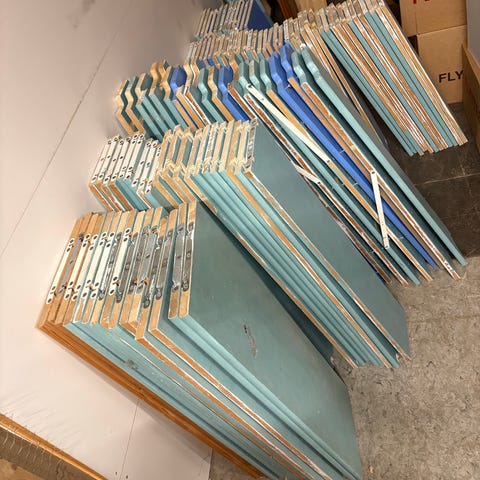 Hyller og dør til BBB hjørneseksjon, ny type, lakkert furu. 4 overhyller som passer til 20 cm dype vanger. Skap med over- og underhylle, samt ekstrahylle og dør med sotet glass passer til dypere vanger på 36 cm. Dørfester, dørstopper, sokkellist, hjørnestolper og skruer følger med, men leveres uten sidevanger. Alt i svært god stand.