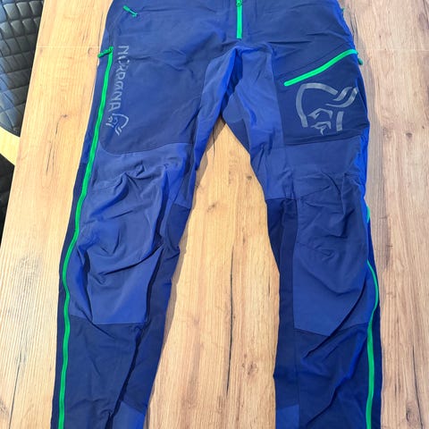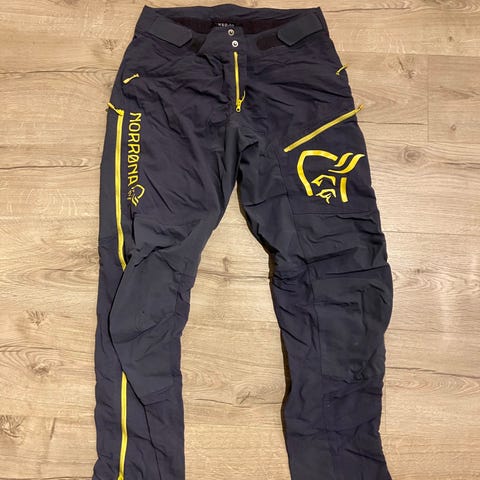 Norrøna Fjørå turbukse for herre i størrelse S, blå farge. Designet for sykling, turbukse og utendørsaktiviteter med funksjonelle detaljer som glidelåslommer og justerbar midje.