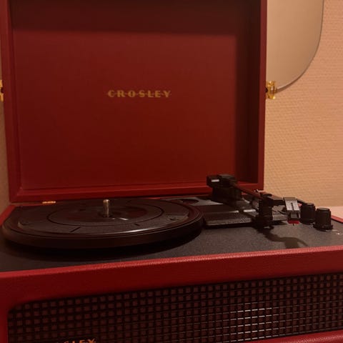 Fin Crosley Cruiser platespiller med bærbar koffertdesign. Utstyrt med innebygde høyttalere og mulighet for tilkobling med Bluetooth, AUX eller til høytalere. Strømledning følger med. I tipp topp stand, blir bare for lite brukt her i hus.