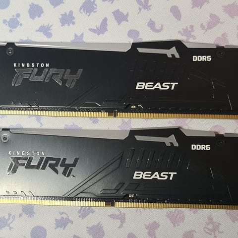 Kingston Fury Beast RAM-moduler. To moduler designet for datamaskiner, med svart kjøleribbe og DDR5-teknologi. Passer til bruk i stasjonære PC-er for ytelsesforbedring.