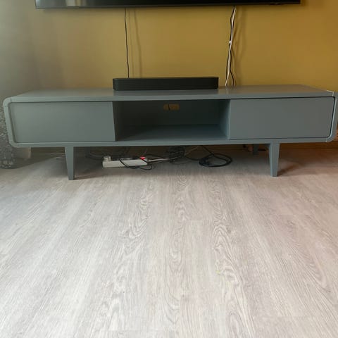 Pent brukt tv-benk med fin grønnfarge på skuffene.