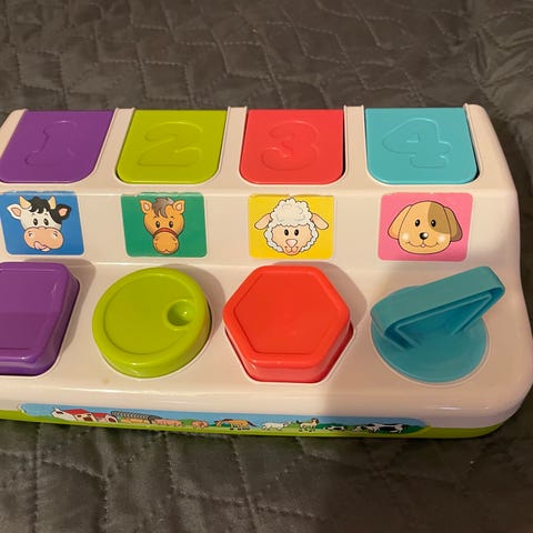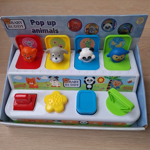 Leketøyet har fire dyrefigurer som kan trykkes ned og fire forskjellige former som kan roteres og trykkes. Egnet for små barn som lærer om former og farger.