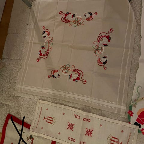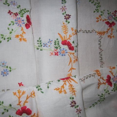 Håndbrodert duk, på fast fint stoff lin/bomull, ingen slitasje. eldre duk som har ligget pakket bort endel år. meget pent forseggjort arbeid, ca 103 x 105cm