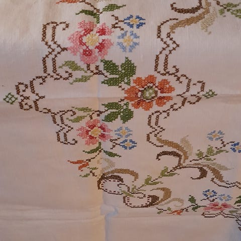 Håndbrodert firkantet duk, forseggjort arbeid.