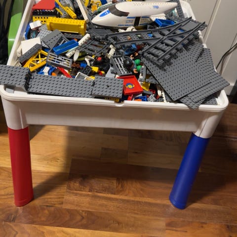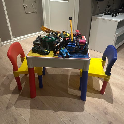 Lego barnebord med fire matchende stoler i flere farger. Bordet har en unik form med et rundt hull i midten som kan brukes til oppbevaring. Passer til barn og er laget i slitesterkt materiale.