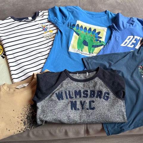8 langermet t shorter i str 122/128. To i str 120, en i 122 og resten er 122/128. Anmerkninger kan forekomme. Fant ett lite hull på den ene, se bilde.