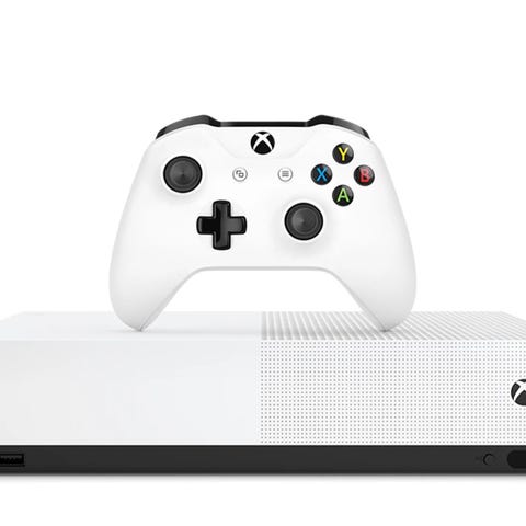 Xbox One konsoll med tilhørende kontroller og nødvendige kabler for tilkobling og strøm. Konsollen er i hvit farge med svart detaljering. Kontrolleren er svart med standard knappoppsett.
