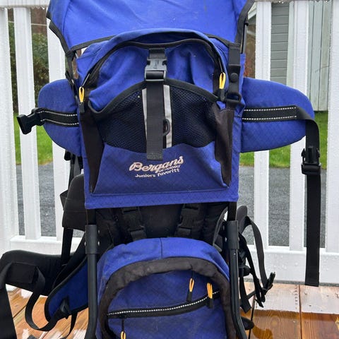 Bæremeis fra Bergans. Designet for å bære barn på ryggen med justerbare stropper og sikkerhetsbelte. Utstyrt med polstret sete og ryggstøtte for komfort under bruk.