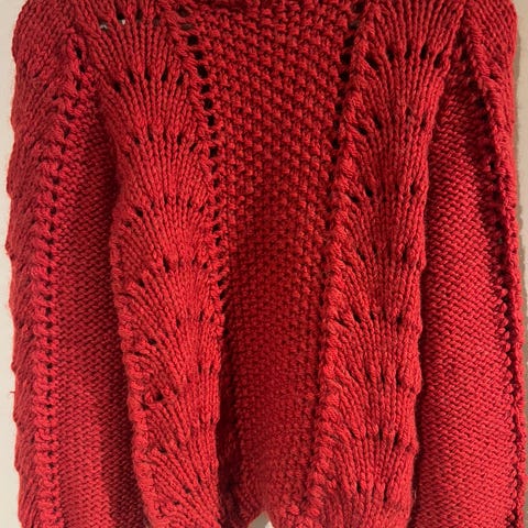 Hjemmestrikket genser selges da den ikke blir brukt lenger. Har blitt brukt et par ganger, men ingen bruksmerker. Vil si denne tilsvarer en str S-M. Veldig fin burgunder farge.