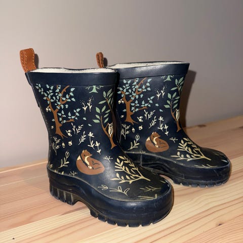 Kuling støvler / gummistøvler / regnstøvler til barn i størrelse 24. Støvlene er unisex og har skogs-mønster. De har en praktisk hempe bak for enkel påkledning, de er ikke foret. Skoene er godt brukt av ett barn, men føttene holder seg fortsatt tørre. Den ene refleksen bak er falt av. Stoffet ved toppen av skoen på innsiden har løsnet litt, men er limt på igjen på den ene skoen.