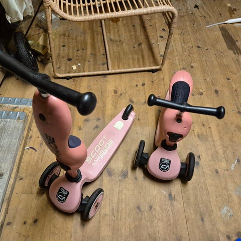 Scoot and Ride Highwaykick 1 sparkesykkel i rosa. Utstyrt med tre hjul for stabilitet, egnet for små barn som lærer å balansere og kjøre sparkesykkel. Følger med hjelm i str s-m. Kun brukt inne, aldri vært brukt ute.