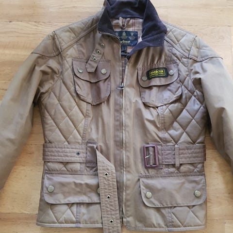 Selger en pent brikt barbour voksjakke. Jakken trenger nok en ny runde med voksing før den tas i bruk. Passer en som bruker S til vanlig. Jakken har en navy farge