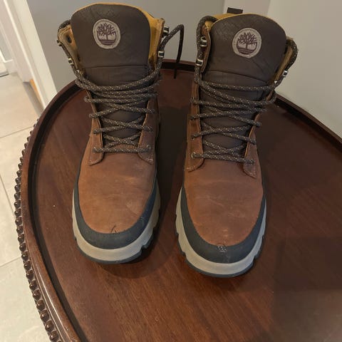 Timberland støvler i størrelse 39, brun farge. Laget i slitesterkt materiale med snøring og polstret krage for komfort. Lett såle. Hentes på Torshov.