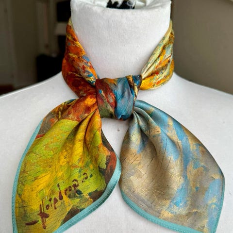 Flott silkeskjerf. Mykt og behagelig. Skjerfet er i Mulberry silke som er den beste silke kvaliteten. 100% silke. Helt som nytt. Størrelse 68x68 cm. Dette er er riktig størrelse om man ønsker å putte endene inn under fronten på vest eller bunad. Kan gjerne sende med posten til 31.-så sparer man litt på frakten.