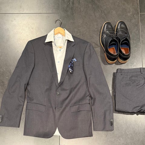 Skredderarbeid for ca. 5 500 kr er utført, og dressen fremstår betydelig oppgradert sammenlignet med original passform.