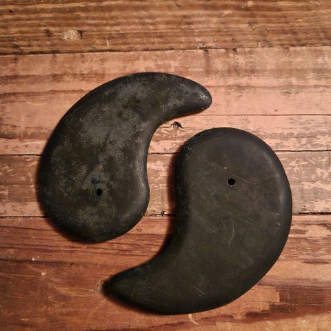 Selger en gua sha-stein i mørk naturstein, brukt til ansiktsmassasje og hudpleie. Formen passer godt til kjeve, kinn, panne og nakke, og brukes for å stimulere blodsirkulasjon og gi avslapning i ansiktsmuskulaturen.