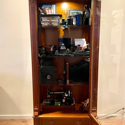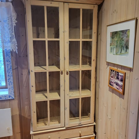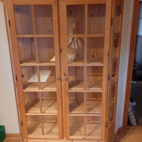 2 etasjer, med skyvedører i glass,(den nederste er fjernet, men jeg har døre) LED-lys (trenger driver) og låsbar topphylle med nøkkel