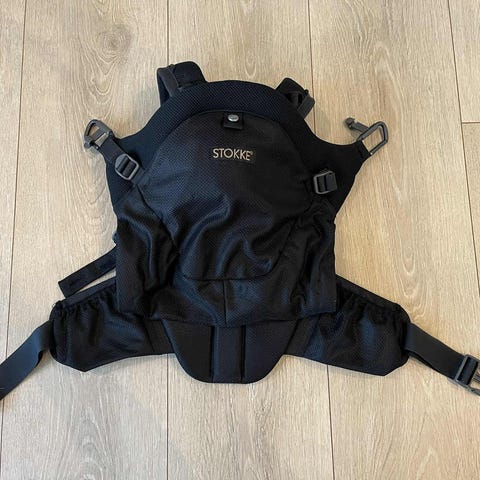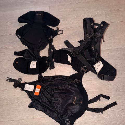 Kommer med tilbehør for å bære foran i den første tiden, og bak på rygg etter hvert. Har synlige flekker av bruk.