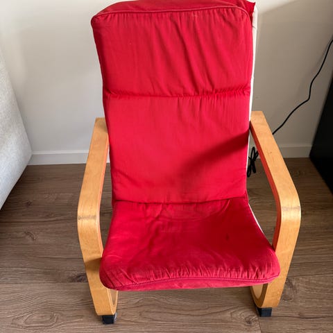 Barnestol av ukjent merke, heil og solid. Normale bruksmerker. Kjøpt brukt i 2017.