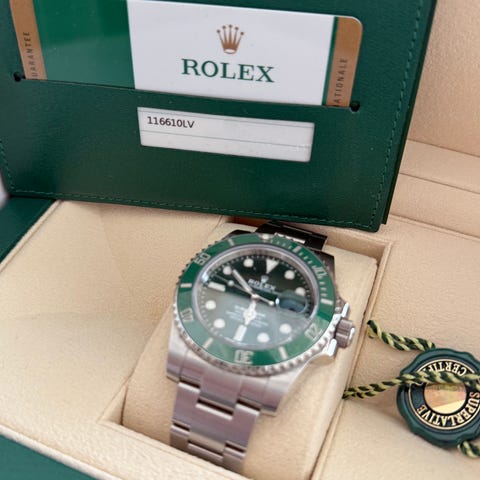 Leveres som komplett sett: Original ytterpapp, innerboks, grønn tag, manual, garant, norsk sertifikat fra Lervik ur, ekstra ledd slik at den har komplett oysterlenke. Følger også med en nato reim.